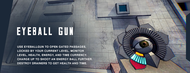 - Collect Level Ups to upgrade your Eyegun, allowing you to shoot stronger and farther, and to open gates and paths that were previously closed.